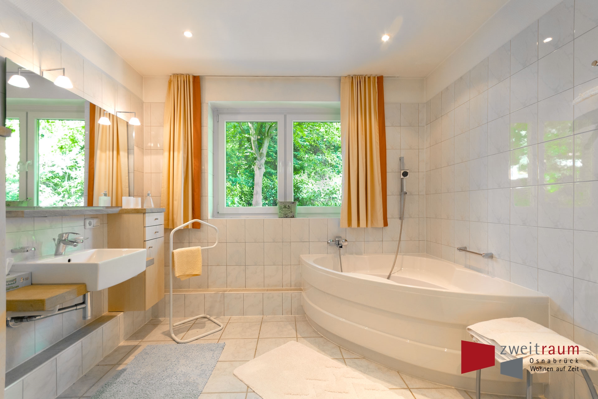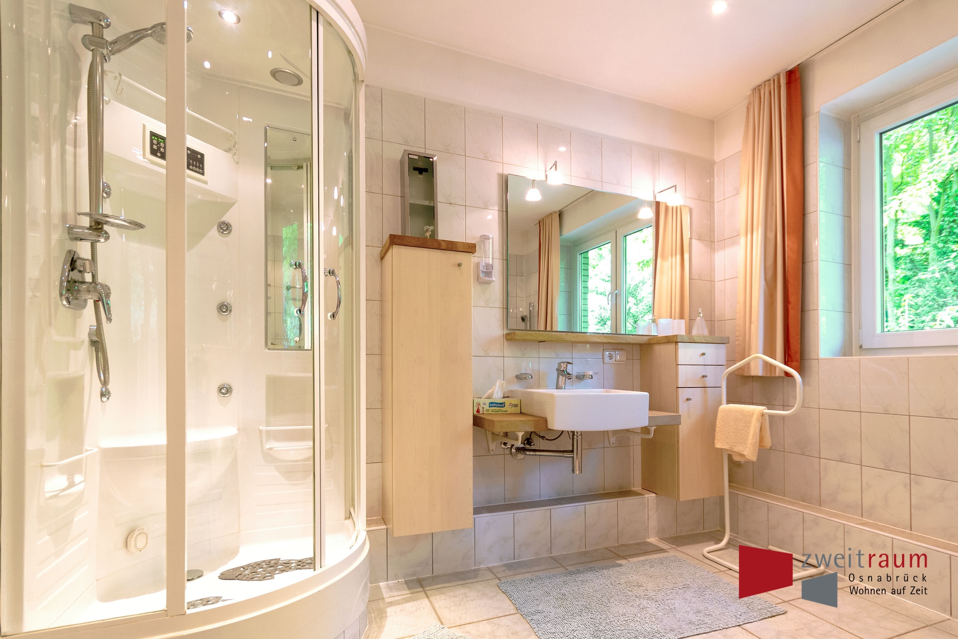 Sehr gepflegte, hochwertige und großzügig geschnittene 3-ZKB-Wohnung im 1.OG eines 2-Familienhauses mit kleiner Terrasse. Das schöne helle Wohn-Esszimmer mit großer Fensterfront ist modern ausgestattet mit 2 weißen Ledersofas, einem Couchtisch, einem Fernsehtisch mit Fernseher (Sat-TV), einem Regal mit Stereoanlage, einem Gel-Kamin und einem schönen Esstisch mit 4 Stühlen und einer Eck-Vitrine; die Küche verfügt über eine neue, moderne Küchenzeile mit Ceran-Kochfeld, Backofen, Kühlschrank mit Gefrierfach, Spüle, Mikrowelle und ist komplett ausgestattet mit Kaffeemaschine, Geschirr, Gläsern, Koch-Utensilien , Geschirrtüchern, etc.; das große, helle Bad verfügt über ein Waschbecken, ein optisch abgeteiltes WC, eine Badewanne und eine übergroße Dusche; das große Schlafzimmer mit Fussboden-Heizung ist eingerichtet mit kleinem Einbauschrank, Doppelbett (160×200), Nachttisch und Schreibtisch; das Gästezimmer hat 2 Einzelbetten und einen Kleiderschrank sowie eine große Fensterfront; Wohn-Ess- und Gästezimmer haben hochwertigen Laminat-Fussboden, alle anderen Räume sind gefliest; ein PKW-Stellplatz ist vorhanden; Internet und Telefon auf Anfrage (Flate-Rate); Waschmaschine, Bettwäsche und Handtücher inklusive. Auf Anfrage gegen Aufpreis auch Reinigungsservice möglich; ideal für bis zu 4 Personen; ruhige und gehobene Lage in Bissendorf; gute Autobahnanbindung; ca. 9 km zum Zentrum Osnabrück. Bis 2 Personen EUR 1.350,- Monat, bei 3 bzw. 4 Personen zzgl. 100,- EUR Monat Person , Miete zzgl. Strom.