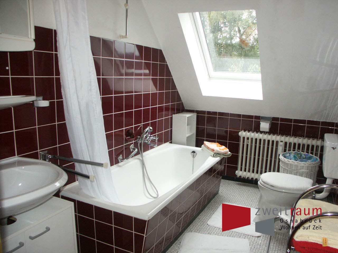 Solide eingerichtete 2-ZKB-Wohnung im Dachgeschoss eines 2-Fam.-Hauses mit sehr schönem, großen Balkon am Ortsrand von Hollage; Wohn-Esszimmer ist mit Essecke, Sofa, Sessel, Schlafcouch, Tisch und Flat-TV mit SAT Anschluss eingerichtet; Schlafzimmer mit komfortablem Doppelbett (180×200), Nachttisch und 4-türigem Kleiderschrank; die Küche ist mit Einbauzeile (Herd, Ofen, Kühlschrank, Spüle, Kaffeemaschine, Toaster, Geschirr, Gläser, Kochutensilien, etc.) und kleinem Esstisch ausgestattet; das Bad ist mit Wanne (mit Duschvorrichtung und Vorhang), Waschbecken und WC; Staubsauger; separater Eingang; gute Parkmöglichkeit vor dem Haus; sehr ruhige Lage; ca. 10 km zur Innenstadt von Osnabrück. Bei 2 Personen zzgl. EUR 100,- Monat. Miete zzgl. Strom.