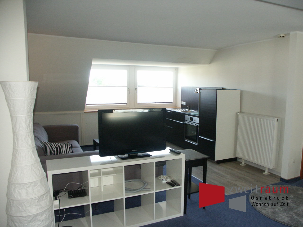 Modern möbliertes 1 Zimmer Apartment im DG eines 2 Familienhauses. Großer Wohn-Schlafraum mit Küchenzeile, Sofa, großem Esstisch der auch als Schreibtisch genutzt werden kann. Neuwertiges modernes Bad. Waschmaschine im Keller vorhanden.