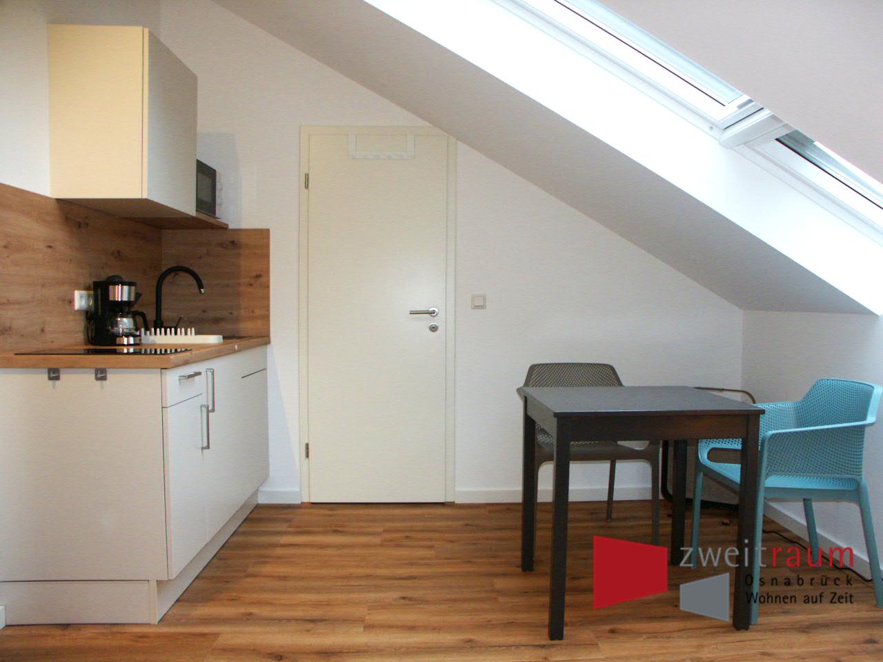 Modernes Apartment mit WohnSchlafraum, integrierter kleiner Einbauküche, Bad mit Dusche und WC. Die Einbauküche ist komplett ausgestattet und verfügt über gängige Küchenutensilien, der helle Wohnbereich ist mit Sitzgelegenheit und Bett ausgestattet. Die Panoramafenster lassen viel Tageslicht in den Raum, die Jalousien lassen sich elektrisch bedienen. Für das Bett ist Bettzeug und Bettwäsche vorhanden, die Beheizung findet über Elektoheizung statt. Waschmaschine und Trockner stehen im Keller zur Verfügung. Von der Grundfläche ist das Apartment deutlich größer, da Dachschrägen vorhanden sind. Miete zzgl. EUR 50,- Monat für monatliche Reinigung.