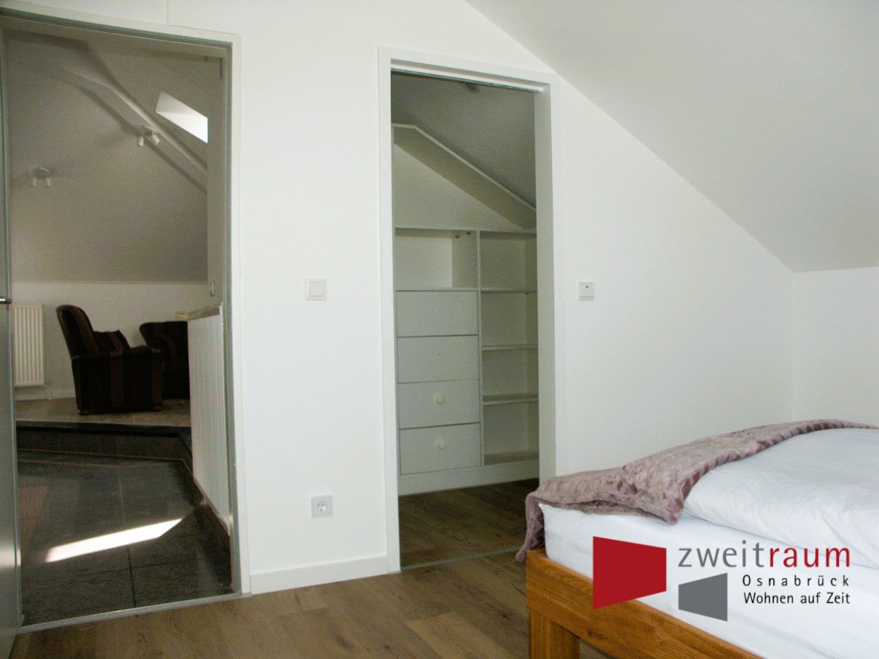 Möblierte Wohnung mit außergewöhnlichem Grundriss. Der großzügige Wohnraum mit integrierter Küchenzeile teilt sich über eine kleine Empore in den Relaxbereich mit Sofalandschaft und TV. Das Schlafzimmer ist mit einem großen Bett in 160×200 ausgestattet und besticht mit einem begehbaren Ankleideraum. Das großzügige Bad mit futuristischer Dusche, WC und Waschbecken liegt direkt neben dem Schlafbereich. Vor dem Apartment liegt ein Balkon, der gemeinschaftlich mit weiteren Bewohnern der Etage genutzt werden kann. Eine Waschmaschine und ein Trockner können von allen Bewohnern kostenlos genutzt werden. Bei 2 Personen zzgl. EUR 100,- Monat. Miete zzgl. EUR 50,- Monat für monatliche Reinigung.