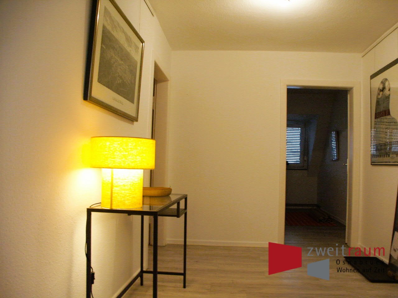 Zentral am Fuße des Westerbergs und wenige Gehminuten vom historischen Stadtzentrum Osnabrücks gelegen bietet diese komplett möblierte 2-Zimmer-Wohnung neben einem geräumigen Wohnzimmer mit Ess- bzw. Arbeitsplatz eine hochwertige Einbauküche mit Miele Küchengeräten (kombinierter Tief- Kühlschrank, Backofen mit Grillfunktion, Herd Spülmaschine), ein Schlafzimmer mit einem Doppelbett (180×200) und Kleiderschrank sowie ein Bad mit Dusche und WC. Die Dachgeschosswohnung ist sehr gut wärmeisoliert. Des weiteren sind vorhanden WLAN, Fernseher, Nespresso-Kapselmaschine sowie eine Münzwaschmaschine (im Keller). – Geschäfte des täglichen Bedarfs (Bäcker, Bio-Markt, Fleischer, Gemüsehändler, Weinhandel, Friseur, Textilreinigung, Ärzte verschiedener Fachrichtungen) sind in fünf Gehminuten genauso gut erreichbar wie die Kultureinrichtungen und zahlreichen Restaurants sowie Bars der Altstadt. Nahegelegen ist der Westerberg mit Botanischem Garten. – Ein Fahrradstellplatz mit stabilem Fahrradbügel steht auf dem Grundstück zur Verfügung. Bei zwei Personen beträgt die Miete zzgl. EUR 100,- Monat. Optional kann ein PkW-Stellplatz direkt vor dem Haus, je nach Verfügbarkeit, für EUR 50,- Monat angemietet werden.
