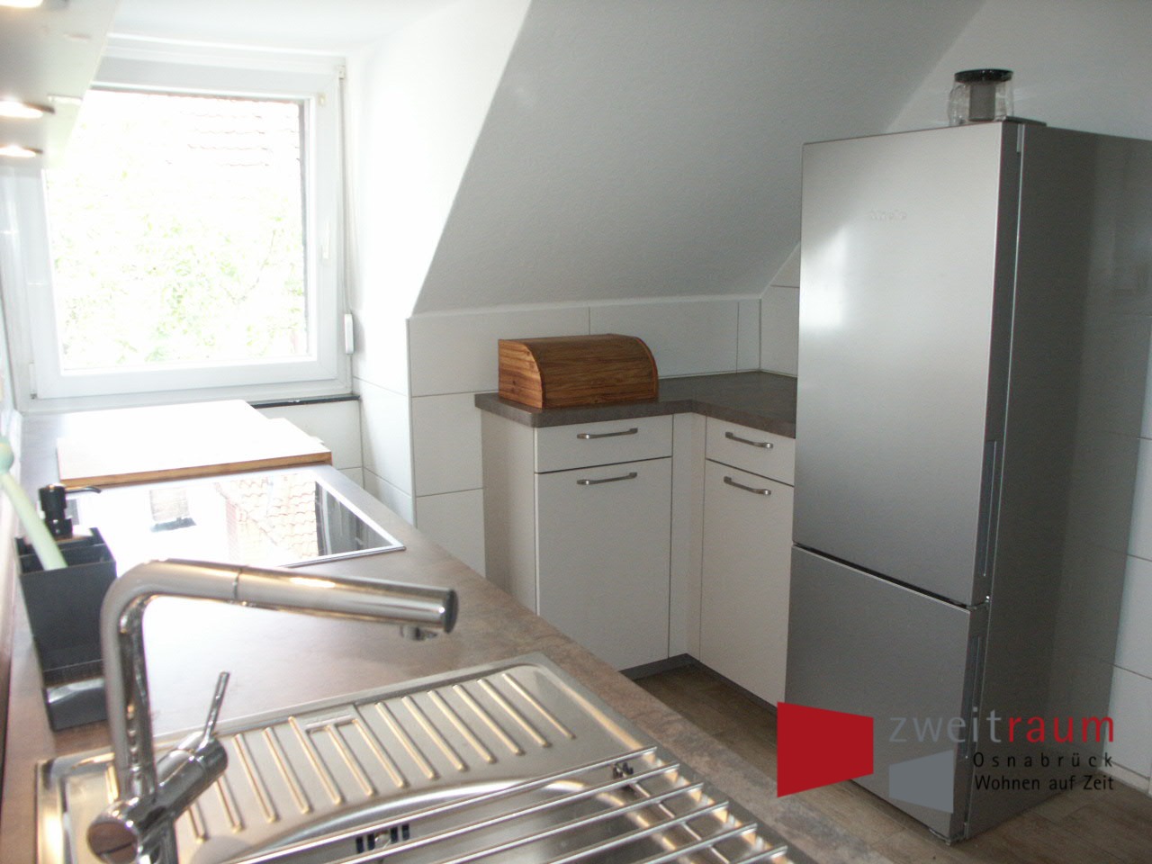 Zentral am Fuße des Westerbergs und wenige Gehminuten vom historischen Stadtzentrum Osnabrücks gelegen bietet diese komplett möblierte 2-Zimmer-Wohnung neben einem geräumigen Wohnzimmer mit Ess- bzw. Arbeitsplatz eine hochwertige Einbauküche mit Miele Küchengeräten (kombinierter Tief- Kühlschrank, Backofen mit Grillfunktion, Herd Spülmaschine), ein Schlafzimmer mit einem Doppelbett (180×200) und Kleiderschrank sowie ein Bad mit Dusche und WC. Die Dachgeschosswohnung ist sehr gut wärmeisoliert. Des weiteren sind vorhanden WLAN, Fernseher, Nespresso-Kapselmaschine sowie eine Münzwaschmaschine (im Keller). – Geschäfte des täglichen Bedarfs (Bäcker, Bio-Markt, Fleischer, Gemüsehändler, Weinhandel, Friseur, Textilreinigung, Ärzte verschiedener Fachrichtungen) sind in fünf Gehminuten genauso gut erreichbar wie die Kultureinrichtungen und zahlreichen Restaurants sowie Bars der Altstadt. Nahegelegen ist der Westerberg mit Botanischem Garten. – Ein Fahrradstellplatz mit stabilem Fahrradbügel steht auf dem Grundstück zur Verfügung. Bei zwei Personen beträgt die Miete zzgl. EUR 100,- Monat. Optional kann ein PkW-Stellplatz direkt vor dem Haus, je nach Verfügbarkeit, für EUR 50,- Monat angemietet werden.